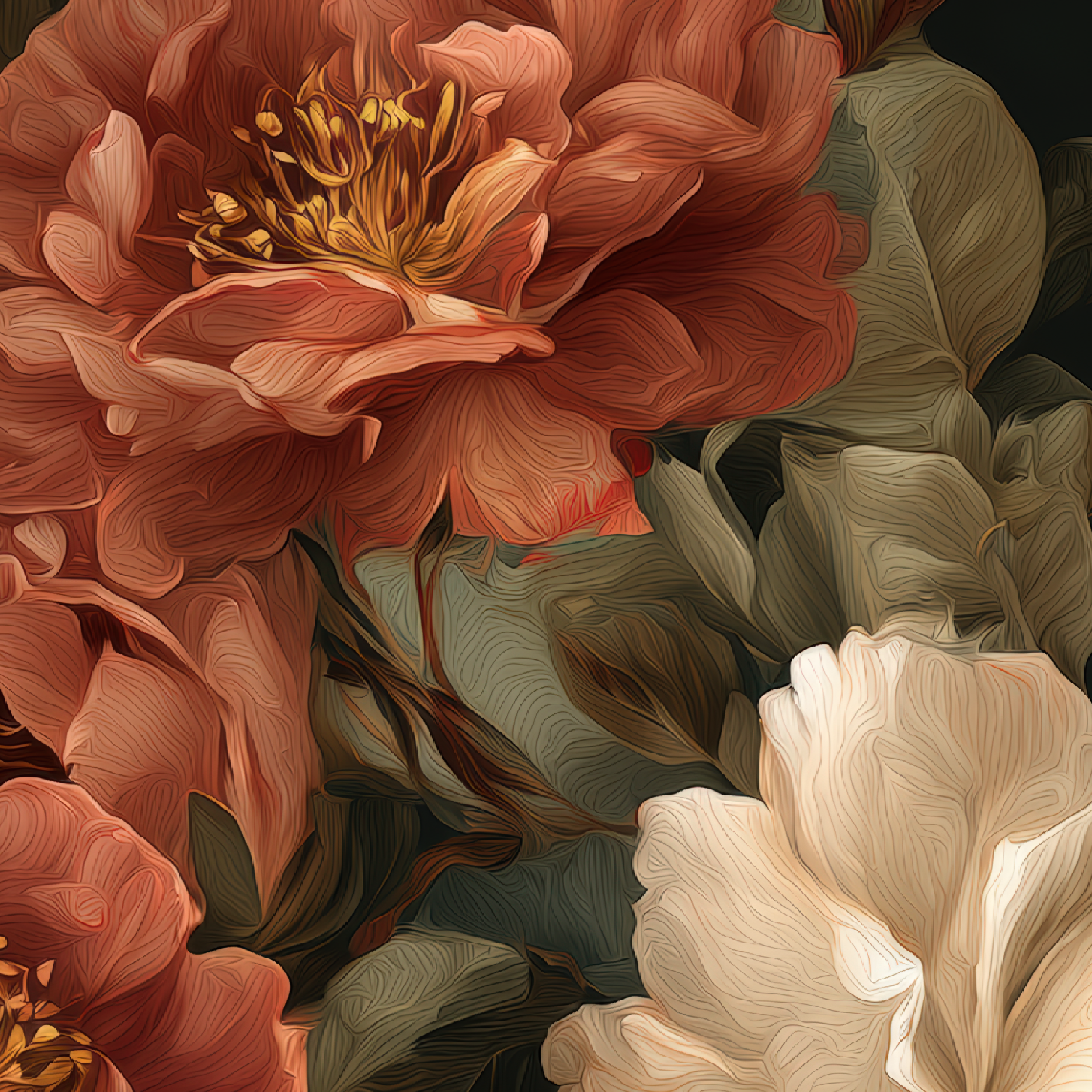 This design works well in studies, libraries, or dining rooms that need a strong focal point. The dark background pulls the colors forward, letting the flowers stand out without feeling bright or modern.
