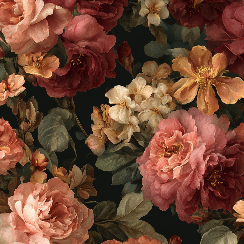 Midnight Conservatory is a floral wallpaper designed for rooms that lean dark, moody, and classic. Large painted roses in dusty pink, deep red, and cream sit against a flat black background, with layered petals and soft shadows giving the pattern depth. It’s bold without feeling overpowering, making it easy to use on a single wall or throughout a space.